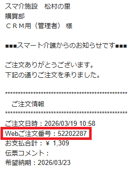 ご注文後にお送りしている、件名:【スマート介護】 ご注文受付完了のご案内 内の、『Webご注文番号:●●●●●●●●』をご用意ください。